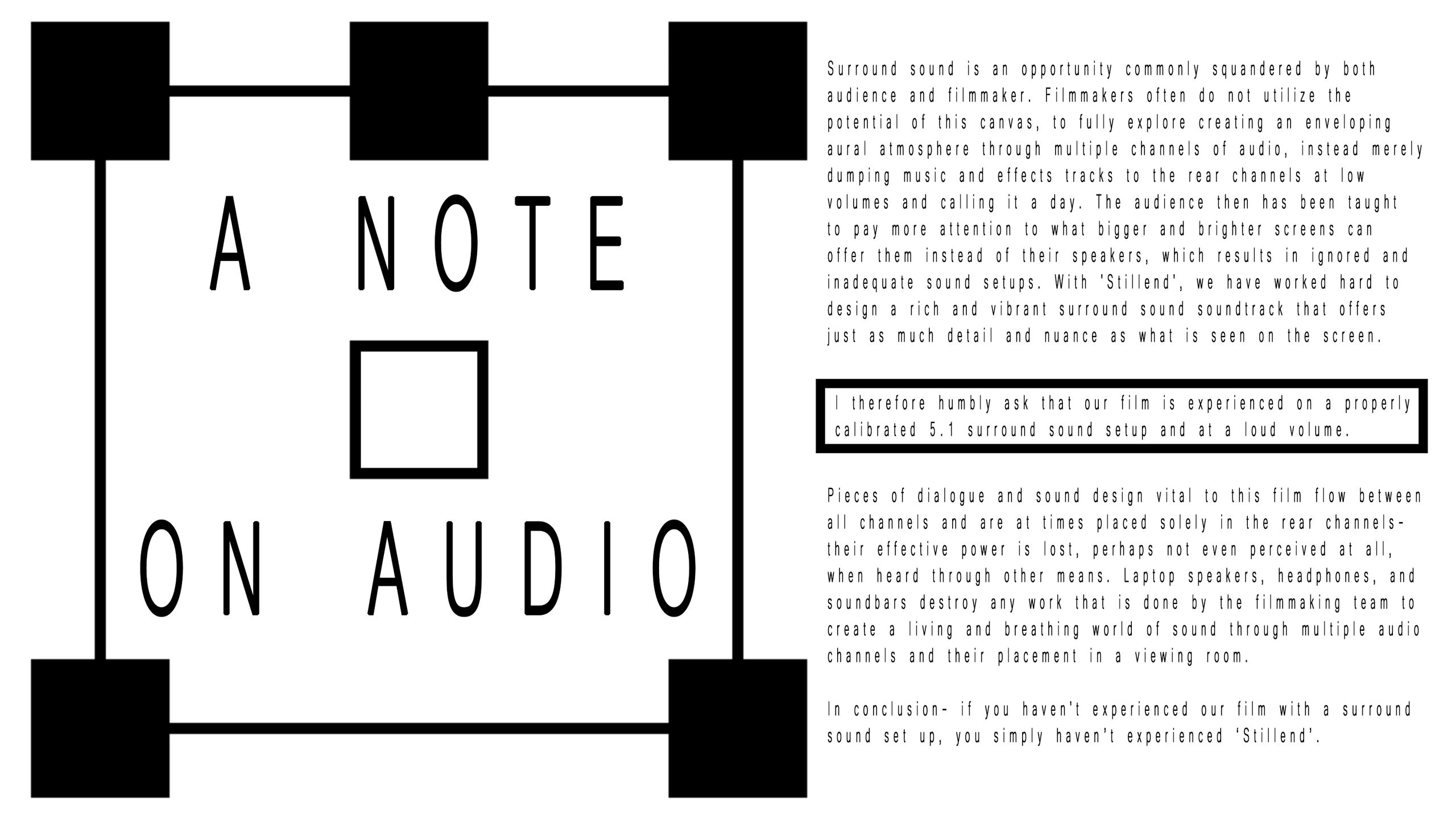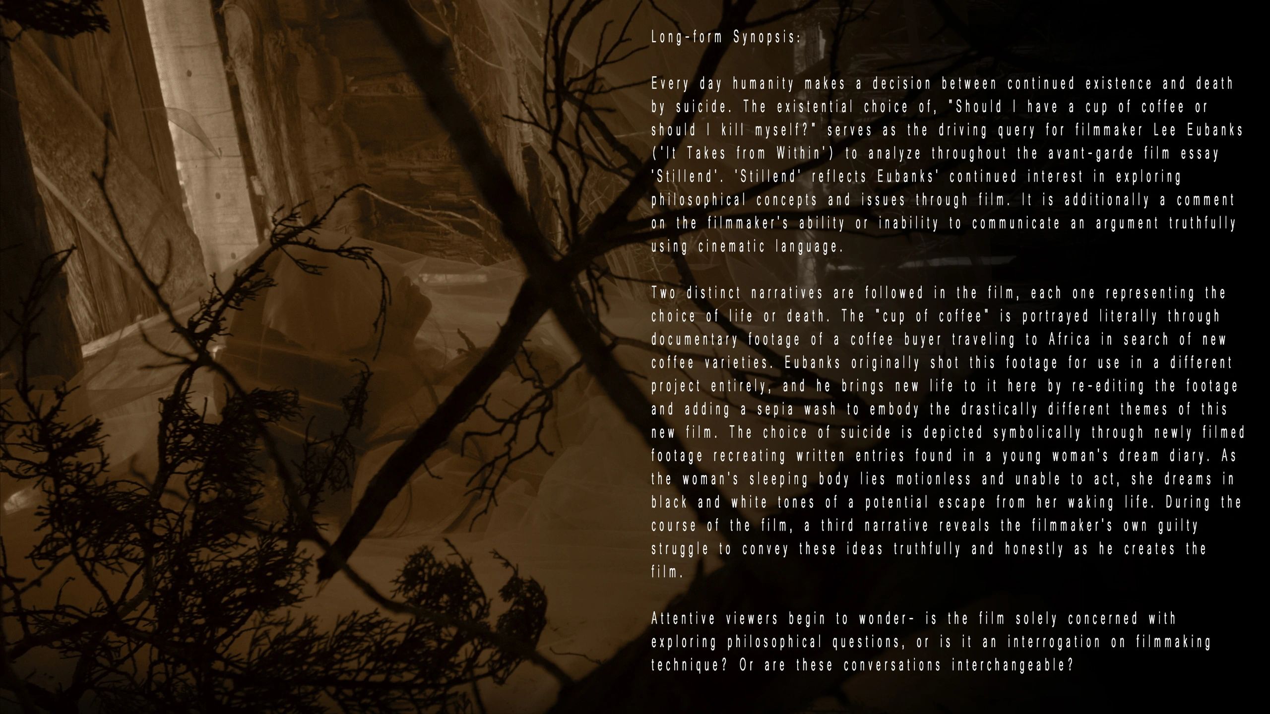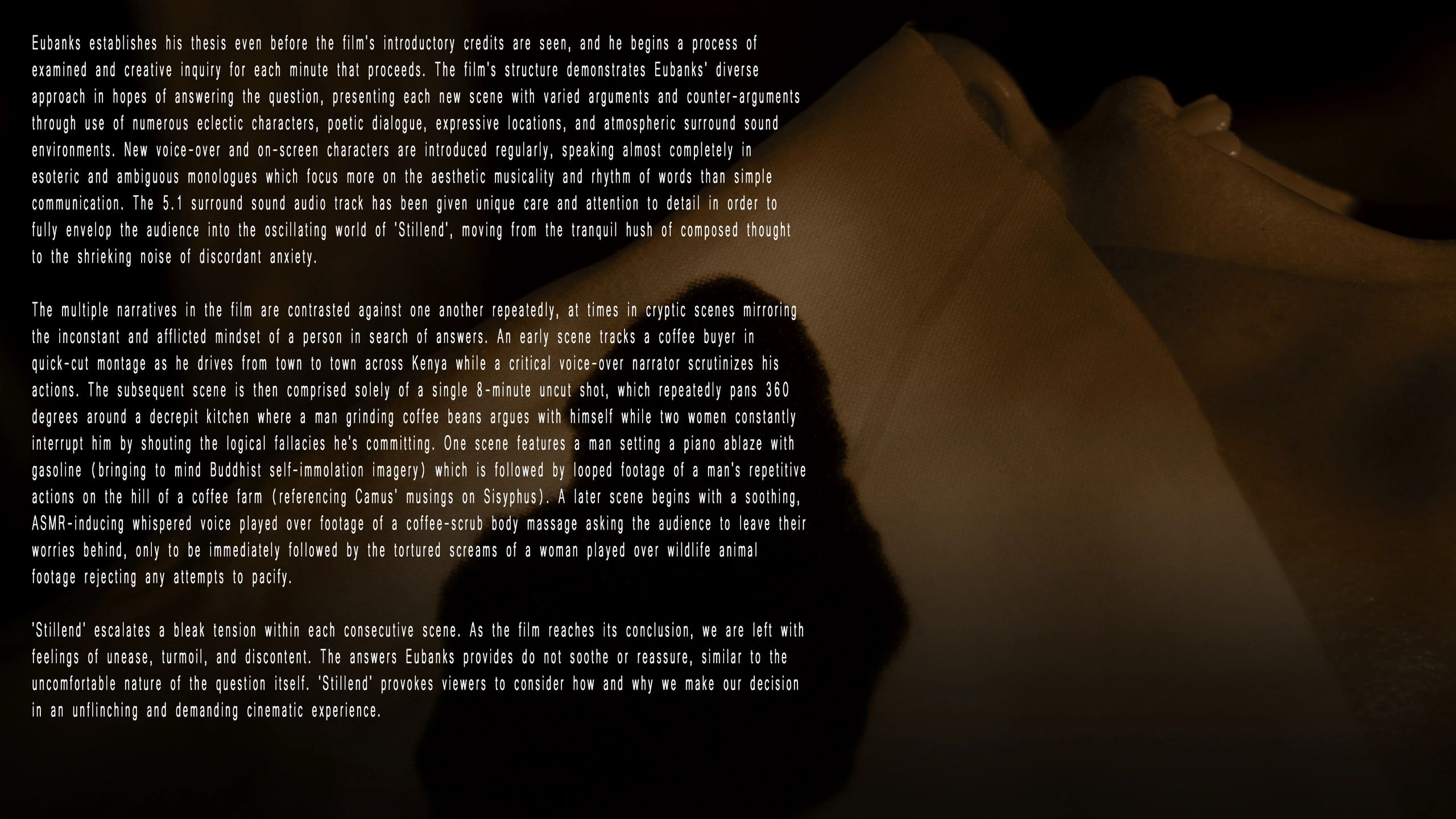 "Stillend is a visually arresting essay on human fulfillment and reality. The repurposing of the documentary footage in conjunction with the performance pieces create a strong multi-sensory vision. The score, sound design, and editing are sharp and effective at delineating an existentialist conflict between one's desires and one's needs." - Eric Hatch, True/False Film Festival